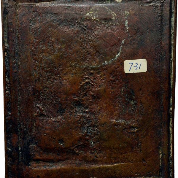 Ae fuso rettangolare, mm 67,7 x 47,0; gr 267,9; patina marrone; anello di sospensione