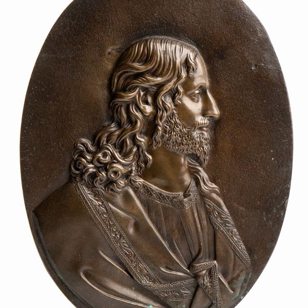 Busto di Cristo con lunghi capelli rivolto a destra.