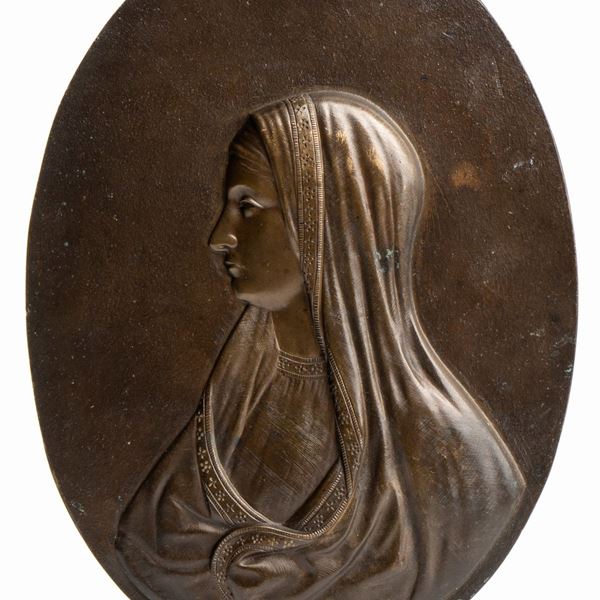 Busto di Maria Vergine verso sinistra ammantata e velata.