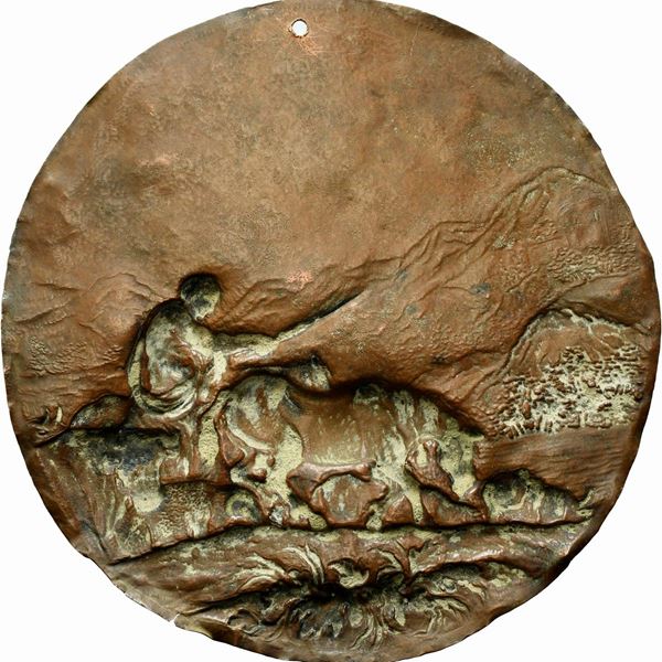 Figura maschile, porta al pascolo vari animali, sfondo con montagne e case.