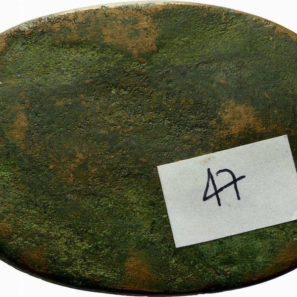 Ae fuso ovale; mm 57,4 x 38,5; gr 40,6. Patina verde artificiale.