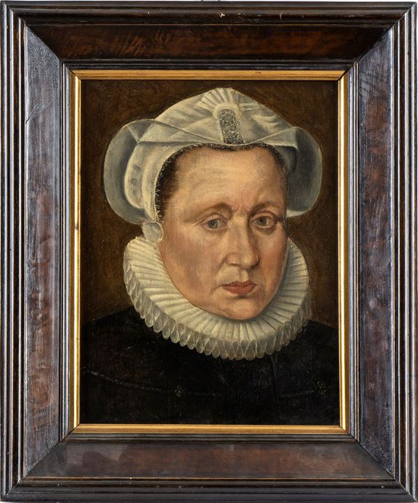 a) Ritratto di dama con cuffia e gorgiera; b) Ritratto di gentiluomo con cappello. Coppia di dipinti