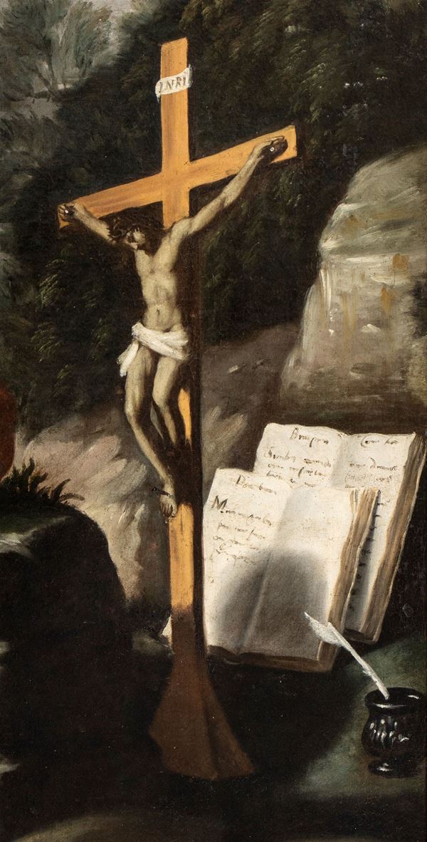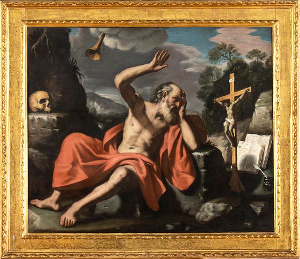 Guercino ebbe una particolare predilezione per il tema di San Gerolamo nel deserto, che ebbe modo di sviluppare lungo l'arco della sua produzione in tutte le possibili declinazioni iconografiche. La presente tela riveste un particolare interesse giacché testimonia quella che viene considerata la più tarda  fra le varie versioni realizzate dal pittore, il cui prototipo autografo è oggi perduto. La composizione ci è però nota grazie a una bella copia di bottega conservata nella Pinacoteca Nazionale di Bologna, della quale il nostro dipinto costituisce una fedele replica coeva.