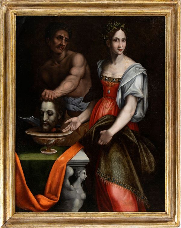 Questo smagliante dipinto replica fedelmente, salvo una riduzione che riguarda la parte inferiore della composizione, la Salomè con la testa del Battista, capolavoro di Cesare da Sesto già appartenuto a Giovanni Paolo Lomazzo, poi all'imperatore Rodolfo II e oggi, infine, conservato presso la National Gallery di Londra. Del mirabile prototipo questa notevole versione recupera i colori smaglianti e accesamente contrastati e la studiata eleganza delle posture dei due protagonisti. L'estrema sofisticazione che costituisce il carattere più saliente dell'originale, frutto di una fase preparatoria particolarmente elaborata, viene perseguita anche nella nostra tela che ricalca l'invenzione originale offrendone una lettura fedele ma declinata in una chiave ancor più marcatamente manierista.