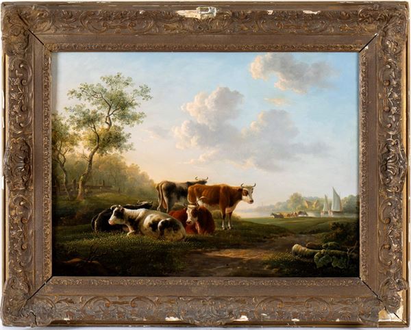 Paesaggio con armenti e corso d'acqua con imbarcazioni sullo sfondo