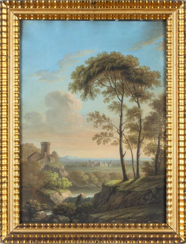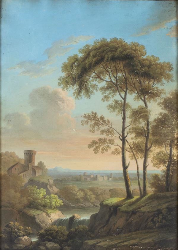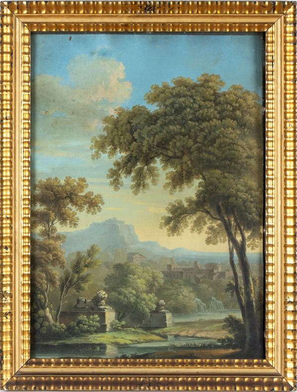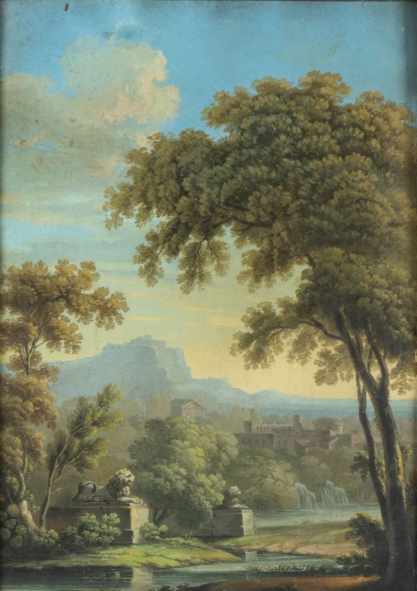 a) Paesaggio con castello e corso d'acqua; b) Paesaggio con corso d'acqua e fontana. Coppia di tempere