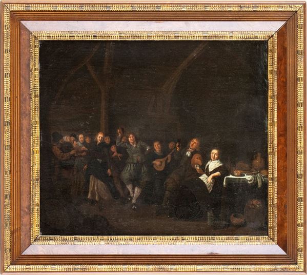 Tra i protagonisti del secolo d’oro della pittura olandese, Jan Miense Molenaer fu forse quello che con più disinvoltura seppe esprimersi su registri espressivi diversi, alternando uno stile più alto, per descrivere la vita della borghesia agiata e dei ceti più elevati, tra cerimonie, intrattenimenti, concerti e ritratti di gruppo, e uno più basso, se non comico, riservato a scene di taverna, feste popolari, situazioni licenziose, giochi dei bambini. Anche il tipo di tecnica adottata si adeguava sapientemente al tenore delle raffigurazioni, passando da una bella pittura, eseguita con accuratezza analitica, a una pennellata molto più ruvida, veloce e sprezzata, affine a quella di Adrian Brouwer e Adriaen Van Ostade. Il presente dipinto appartiene ovviamente a questo secondo ramo della produzione di Molenaer, incentrato su temi ordinari, derivati in parte dalla vita quotidiana, in parte da un immaginario che attinge al mondo dei detti e proverbi popolari, restituiti dal pittore con rustica e divertita fragranza, non senza qualche sotterraneo intento moralistico. A titolo di confronto iconografico e stilistico ci limitiamo a segnalare l’Allegra compagnia in una taverna dello Jagdschloss Grunewald, Berlino, la Festa in famiglia del Victoria & Albert Museum di Londra, l’Osteria del villaggio, degli Staatliche Museen di Berlino.