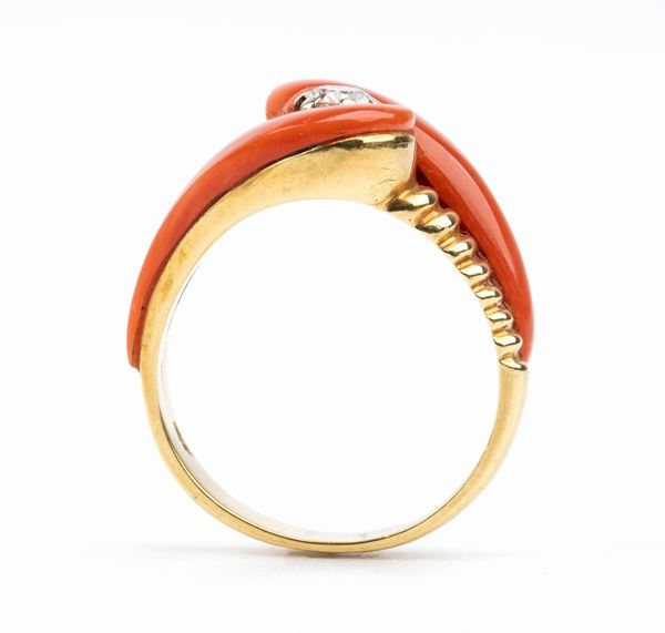 in oro giallo 18k, modellato come una fascia, incastonato con diamante avvolto da un motivo di nastri in inserti di corallo Mediterraneo (corallium rubrum).