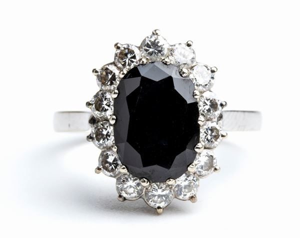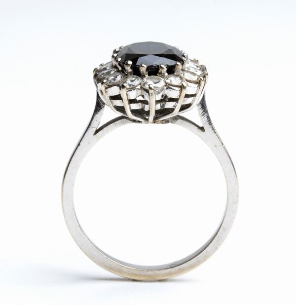 motivo a fiore con zaffiro tra corolla di diamanti.