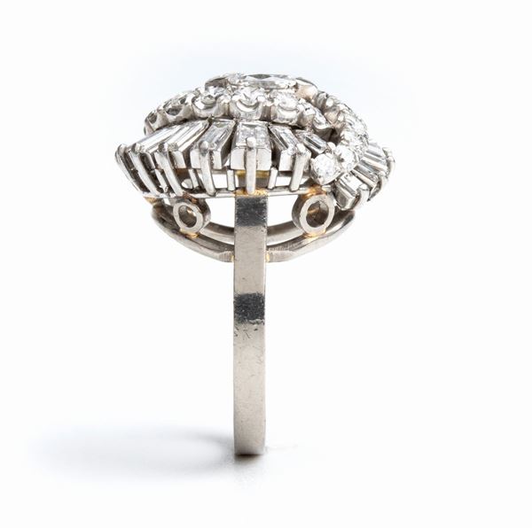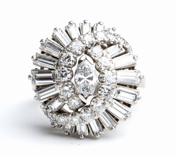 N. 1 diamante, forma a navetta, taglio brillante modificato, n. 20 diamanti, forma rotonda, taglio brillante, n. 20 diamanti, forma rettangolare e trapezoidale, taglio a gradini e taglio tapered, circa 3.10 ct tot; E-F; IF-VVS.