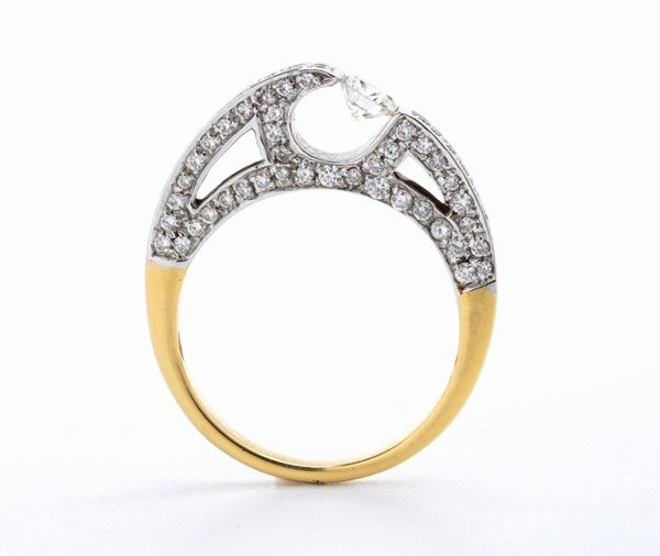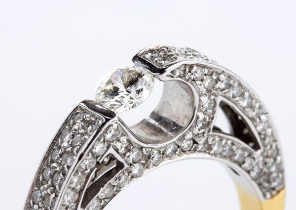 montatura sagomata in oro bianco e giallo 18k impreziosito da pavé di diamanti e diamante centrale.