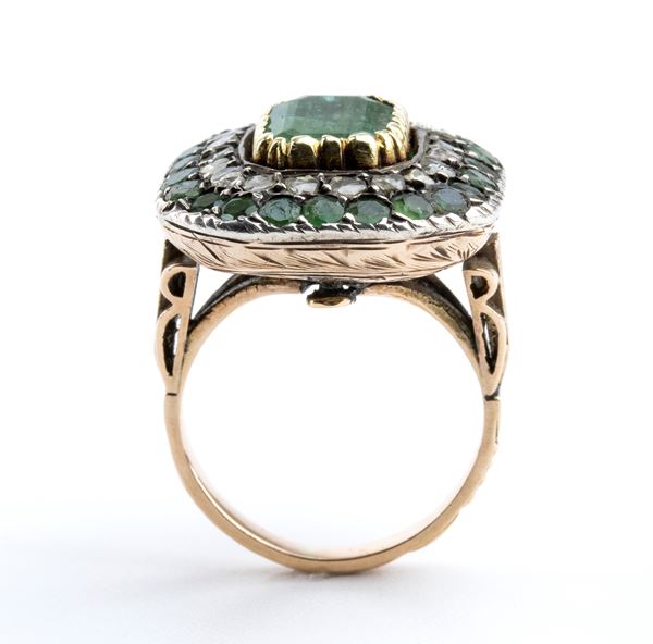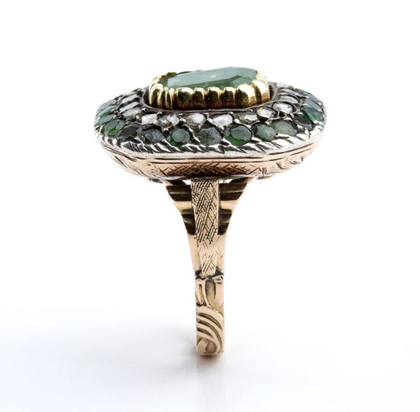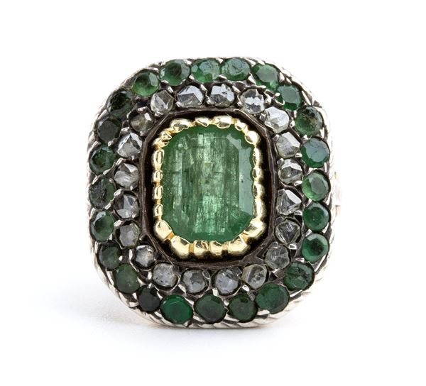 incastonato con smeraldo centrale tra doppia cornice di diamanti taglio a rosa e smeraldi rotondi.