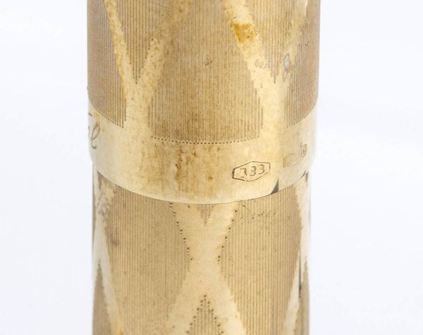 corpo e cappuccio in oro 9k a decori geometrici punzonate "333 - " 5 TO". penna stilografica con sistema di caricamento a stantuffo.