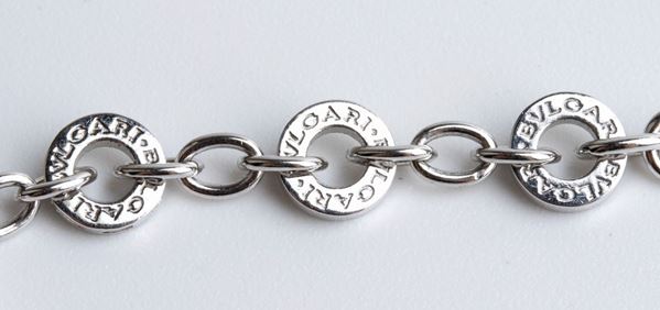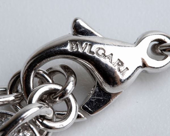 con sottile catena a maglia forzatina in oro bianco 18k interrotta da motivi ad anello con diamanti; sezione centrale con frangia in motivi geometrici circolari a raffigurare una galassia, le cui stelle sono rappresentate da diamanti. Chiusura a moschettone. Firmato "BVLGARI".
