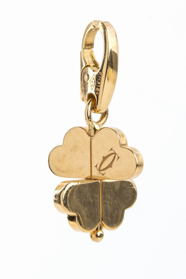 in oro giallo 18k, motivo a quadrifoglio girevole, con moschettone. Firmato "CARTIER".