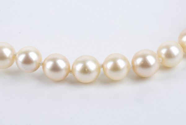 Punzonato "750". Diametro perle 8 - 8,5 mm. Lunghezza 60 cm. Peso 56,2 gr.