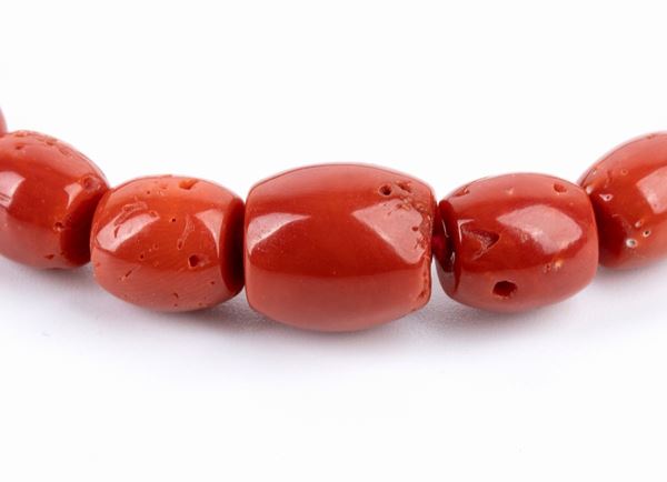 ad un filo di barilotti faccettati di corallo Mediterraneo (corallium rubrum), disposti in gradazione; chiusura in oro giallo 18k.