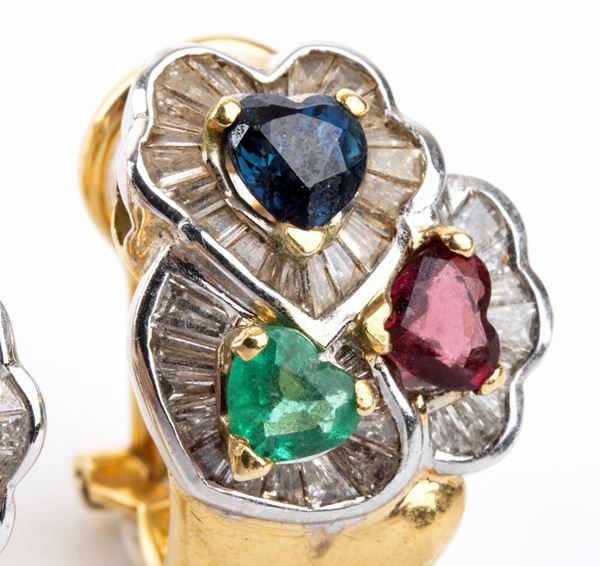 in oro giallo ed oro bianco 18k, ciascuno con tre motivi a cuore in rubino, zaffiro e smeraldo incorniciati da diamanti.