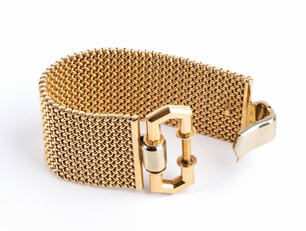 fascia morbida a maglie intrecciate e motivo a fibbia centrale in oro giallo ed oro bianco 18k, manifattura Giuseppe Repossi attivo dagli anni '30.