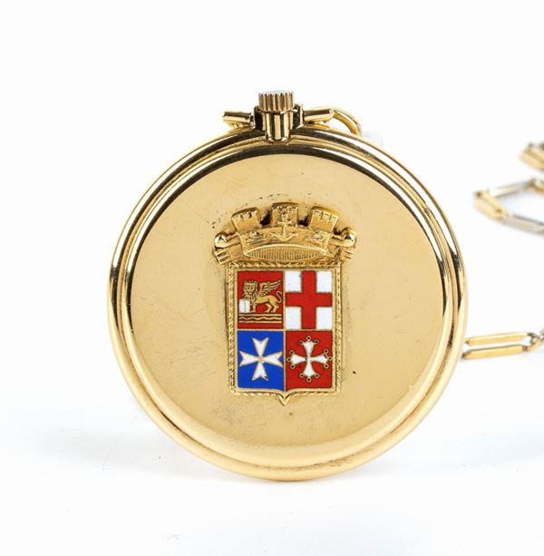 cassa in oro con logo delle Repubbliche Marinare in smalti policromi, quadrante champagne con indici a bastone e sfere neri, movimento al quarzo. Catena in oro bianco e giallo 18K.