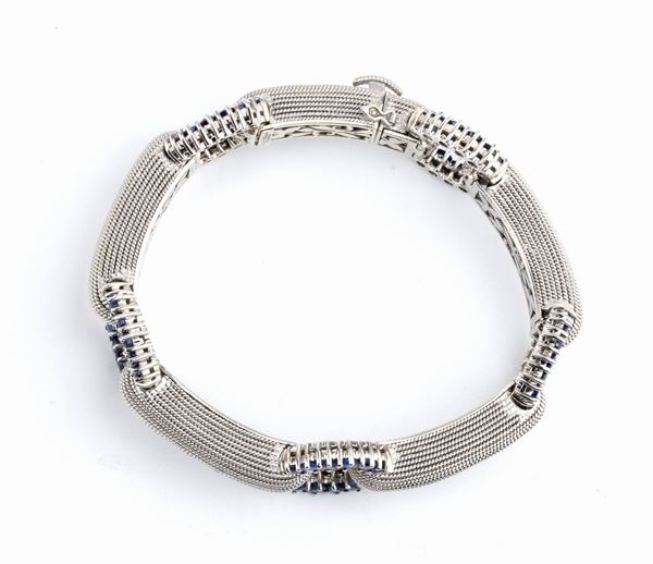 in oro bianco 18k, con linea di elementi a barretta decorati con motivi a cordonetto, allacciati ad anelli incastonati con zaffiri. Firmato VENTRELLA ROMA.