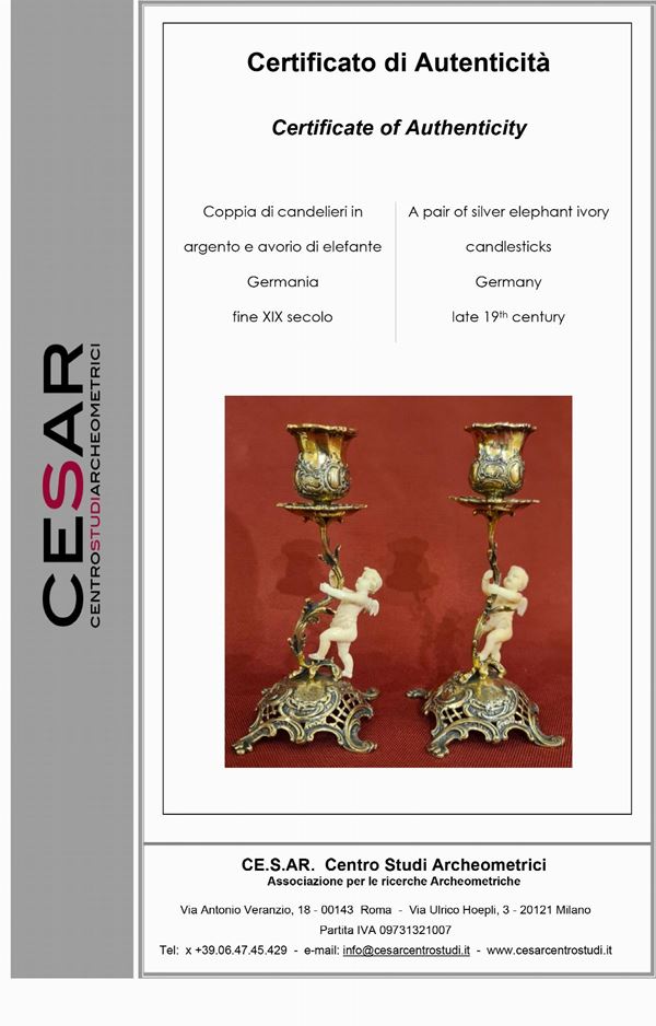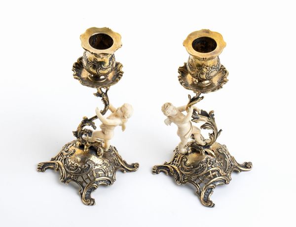 Coppia di candelieri in argento e avorio, Germania, fine XIX secolo, Hanau (?)
