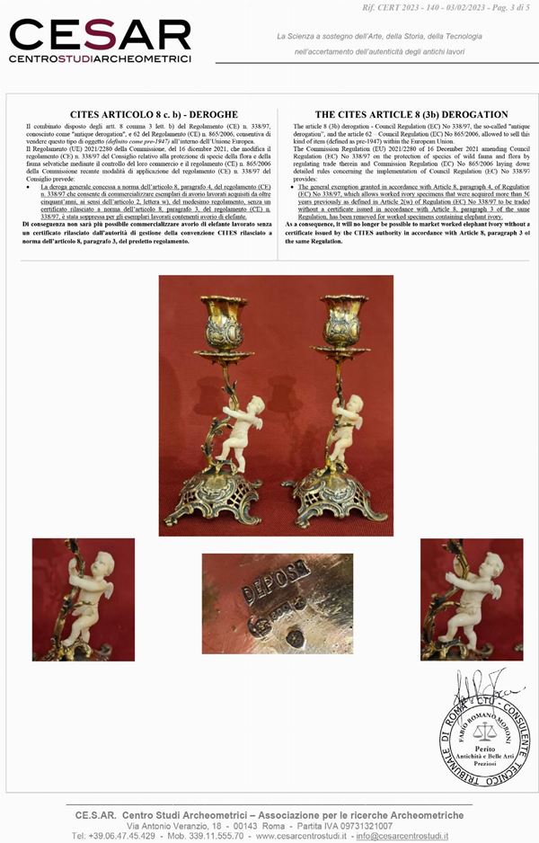 Negli oggetti in questione si ritrovano tutte le tipologie costruttive tipiche dell’epoca e del territorio tra le quali il tipo di fusione scarsamente ripassata a cesello e la doratura galvanica già usata in quell’epoca. I marchi riportati confermano pienamente l’epoca di produzione, in quanto sono entrati in uso nel 1888. Lo stile dei putti in avorio elefantino conferma pienamente un revival barocco, lo stato di conservazione e le patine naturali non lasciano dubbi sull’epoca di produzione.