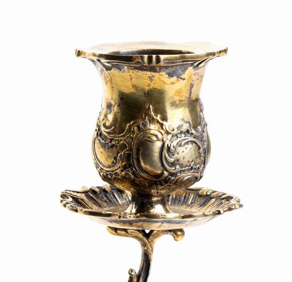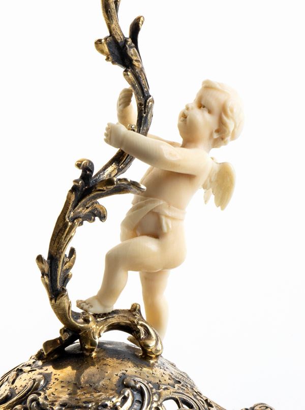 In argento fuso e dorato a decori floreali; sospesi ai fusti fogliati sono presenti due putti alati in avorio di elefante scolpito (Elephas maximus Linnaeus, 1758 o Loxodonta africana Blumenbach, 1797). Punzonati sotto le basi con i marchi per l’argento 800/1000 in uso in Germania dal 1888.