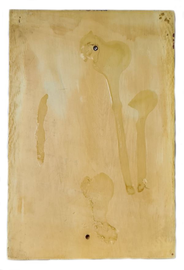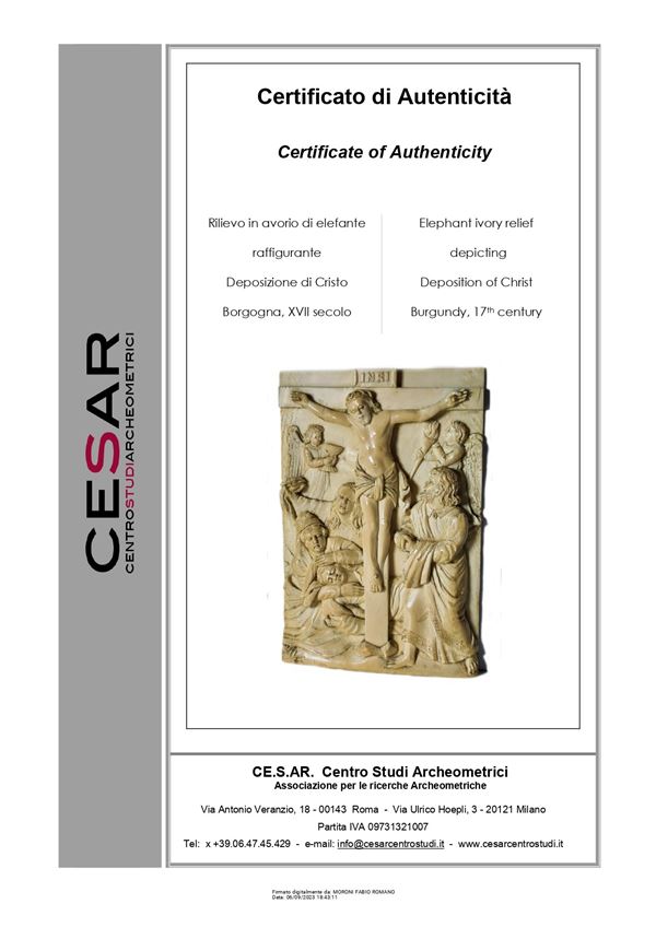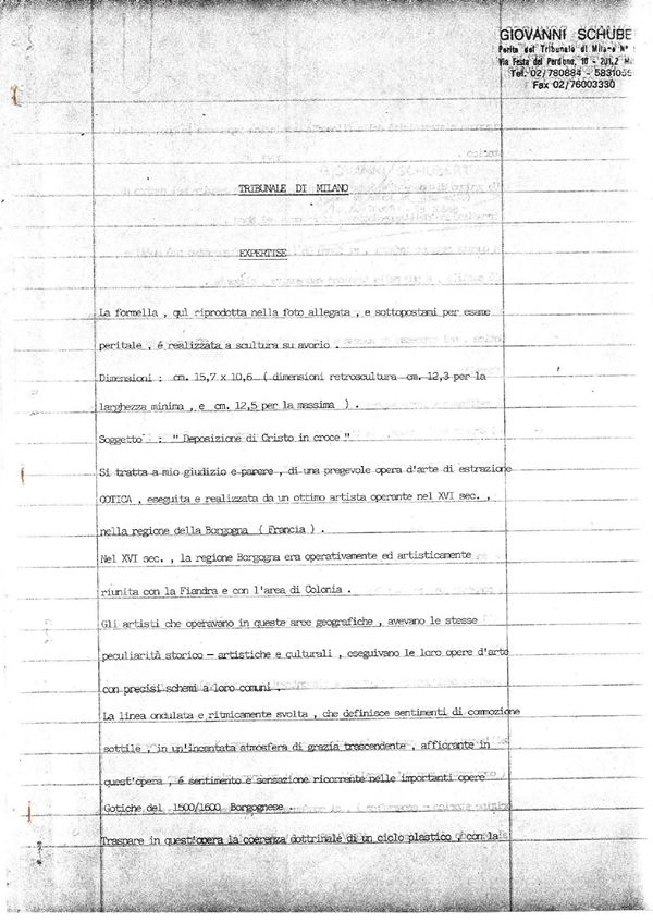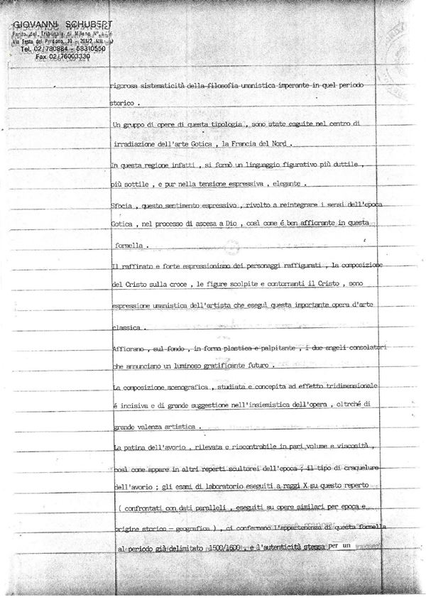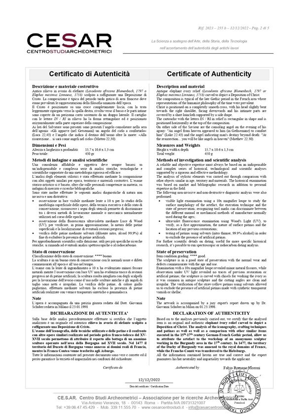 In avorio di elefante (Loxodonta africana Blumenbach, 1797 o Elephas maximus Linnaeus, 1758) finemente scolpito a raffigurante la Crocifissione di Cristo. La composizione è tipica del periodo tardo gotico di area francese dove erano prevalenti le rappresentazioni della filosofia umanista dell’epoca.