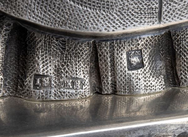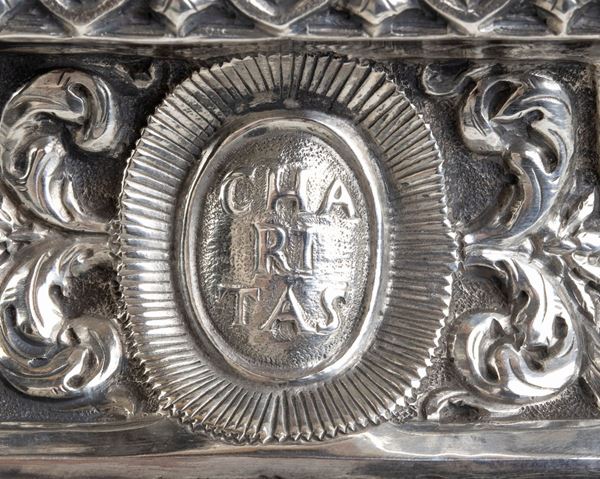 Punzonata con il marchio in uso alla corporazione degli orefici di Napoli per l'argento al titolo di 833/1000 in uso dal 1832 al 1835, saggiatore Paolo De Blasio e con il marchio dell’argentiere Francesco Saverio Rossi; il bollo del maestro è stato precedentemente rilevato su una coppia di giare che si conservano nella sacrestia della Basilica di San Nicola di Bari ed è noto che mel 1835 esegui la statua di S. Luigi Gonzaga per la cappella del tesoro di S. Gennaro.