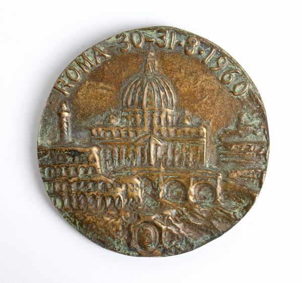 Medaglia in bronzo commemorativa per il VI CONGRES MONDIAL F.I.B.A. del 30-31 Agosto 1960 tenutosi a Roma. Federazione Internazionale Basketball. Patina del tempo, in buone condizioni