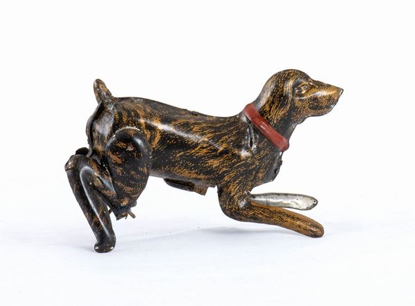 Cane in latta litografata, con meccanismo a scatto che lo fa saltare sulle zampe posteriori. In scatola originale. Made in Italy, non marcato. Anni '920