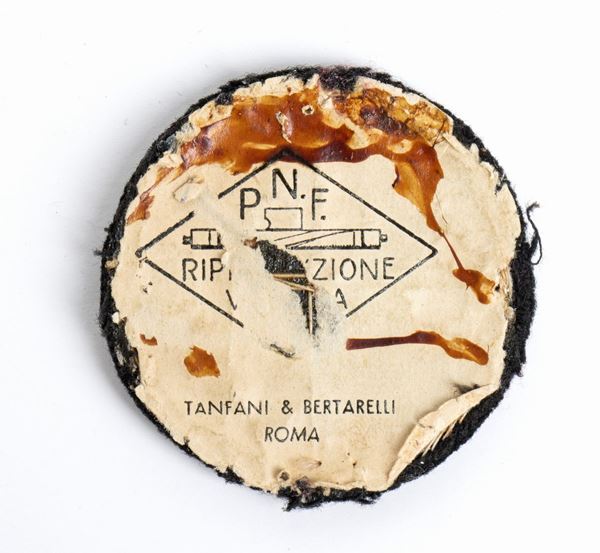 Patch tonda in cotone e canutiglia ricamata, con scudetto tricolore italiano affiancato ad un fascio littorio, e due stelle , per carica dirigenziale del CONI Comitato Olimpico Nazionale Italiano. Marcato al cartiglio posteriore Tanfani & Bertarelli