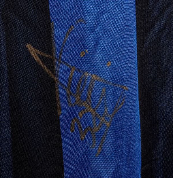 Maglia NIKE nerazzurra numero 32 con autografo di Christian Vieri. Maglia INTER 1908 , maniche corte. Sul fronte patch tonda senza stella applicata al petto a sinistra, logo PIRELLI bianco applicato. Manica destra toppa LEGA CALCIO. Sul retro autografo originale scritto di pugno da Vieri con pennarello nero, sotto il numero di gioco. Maglia da store. Ottime condizioni