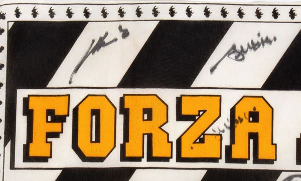 Bandiera celebrativa della JUVENTUS F.C. per la stagione 1985-86 con autografi originali apposti di pugno ad inchiostro nero dai calciatori dell'epoca, tra cui riconosciamo Favero, Caricola, Aldo Serena, Lionello Manfredonia. Bandiera in materiale sintetico, con disegno stampato, in ottime condizioni, pieghe di conservazione. Marcata con Copyrigths Juventus F.C. Tutti i Diritti Riservati