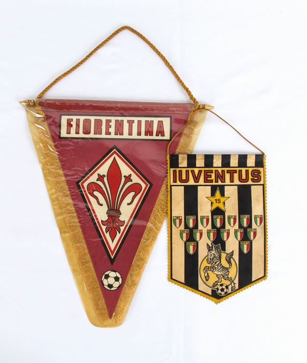 Lotto di due gagliardetti anni '70 in materiale sintetico, stampati, per la squadra viola della FIORENTINA e per quella bianconera della JUVENTUS con il 15' scudetto. In ottime condizioni