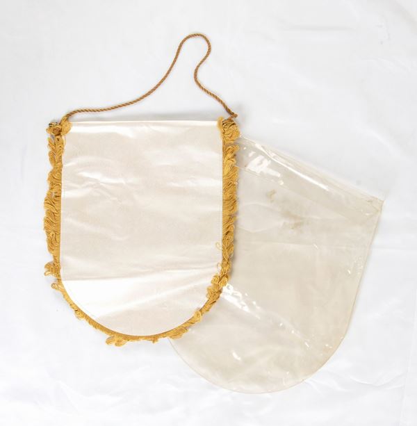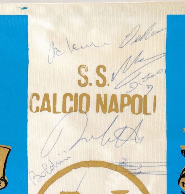 Gagliardetto del NAPOLI, Società Sportiva Calcio, presumibilmente anni 1984-87, con firme autografe di alcuni dei calciatori dell'epoca. Dalla collezione personale del mister Rino Marchesi, firme di pugno dei calciatori, ad inchiostro blu, si riconoscono Diego Armando Maradona, Antonio Carannante, Bruscolotti, Celestini, Napolitano, Dal Fiume. Stampato su materiale sintetico, frangia lungo i bordi, asta in metallo, bustina originale. In ottime condizioni
