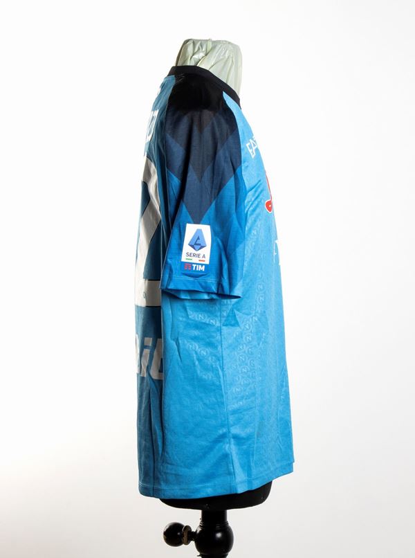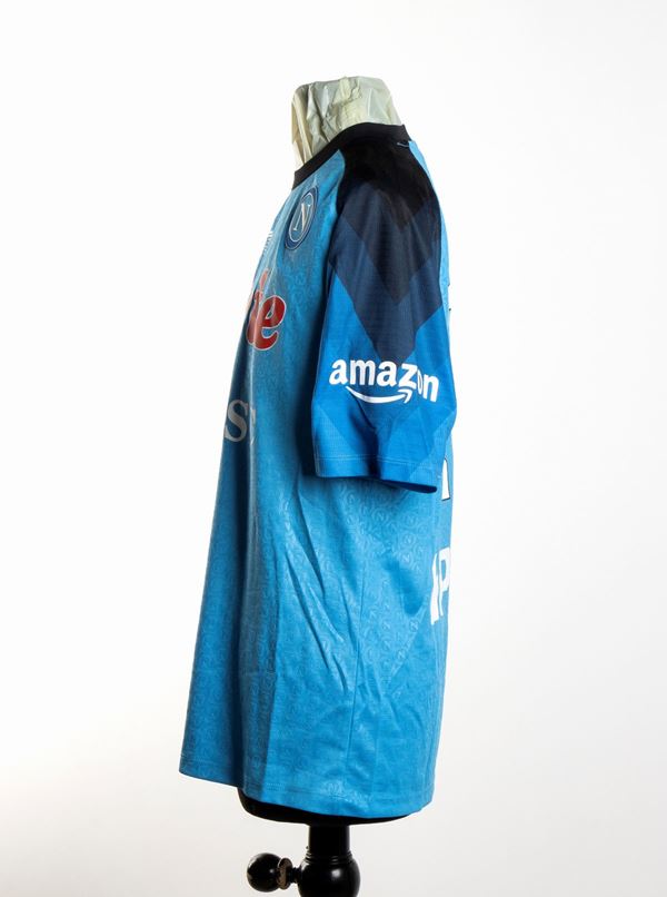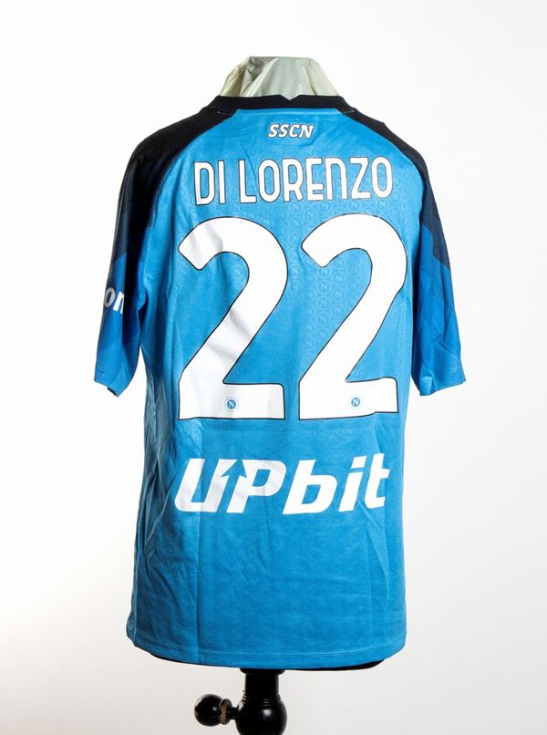 Maglia di gara EA7, maniche corte, stagione 2022/23, indossata. Sul fronte marchio commerciale LETE e MSC, patch Società Sportiva Napoli "N", marchio EA7. Sulla manica destra patch Serie A TIM. Sulla manica sinistra marchio AMAZON. Sulla schiena numero di gioco 22 e nome DI LORENZO con sponsor UPBIT. La maglia è stata indossata per la partita Napoli-Hellas Verona del 15/4/2023. Usata, non lavata, fornita con certificato di garanzia di autenticità. Ottime condizioni