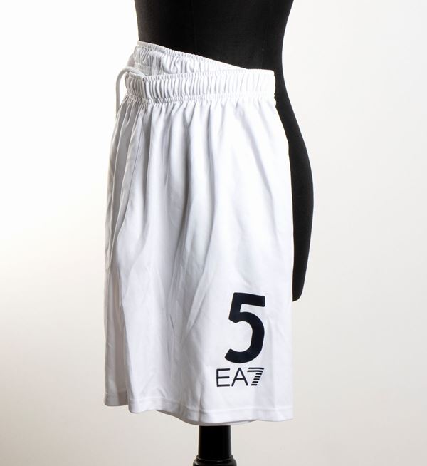 Stagione 2022/2023, pantaloncini da gara, usati da Juan Jesus per la partita Napoli-Milan (0-4) del 3/4/2023. Pantaloncini bianchi, con numero 5 stampato, logo SSC NAPOLI "N" applicato, marchio EA7. Tracce di sporco, macchie verdi dell'erba del campo di gioco, non lavati. Fornito certificato di autenticità con prova fotografica.