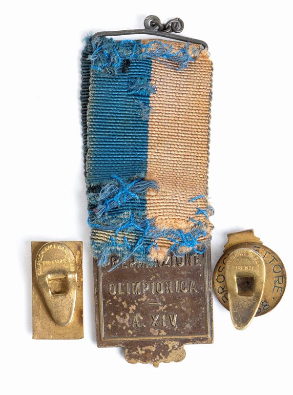 Lotto di medaglia e distintivi, Reale Federazione Italiana Canottaggio, RFIC e FIC, periodo ventennio fascista appartenuto al campione Broschi Ettore. Distintivo per CAMPIONE D'ITALIA SENIORES con piedino, marcato Picchiani & Barlacchi, distintivo tondo F.I.C. CAMPIONE D'EUROPA con piedino, marcato Picchiani & Barlacchi, nominativo al retro BROSCHI ETTORE 1938, badge rettangolare in bronzo e smalti per la PREPARAZIONE OLIMPIONICA A. XIV con nastrino e chatelein originali - Segni del tempo, buone condizioni