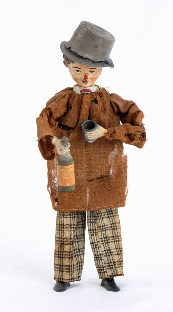 Automa in metallo e latta dipinta a mano, con meccanismo di carica a molla, fine '800 inizio '900. Bevitore ubriaco, con bottiglia di champagne e bicchiere in mano, cappello a cilindro in testa. Marcato DEPOSE F.M. sul cappello e ARTICLE FRANCAIS sulla targhetta applicata alla bottiglia