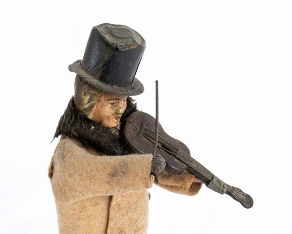 Automa in metallo e latta dipinta a mano, con meccanismo di carica a molla, fine '800 inizio '900. Suonatore di violino, con cappotto bianco, pantaloni a quadretti, e cappello a cilindro in testa. Marcato DEPOSE F.M. sul cappello