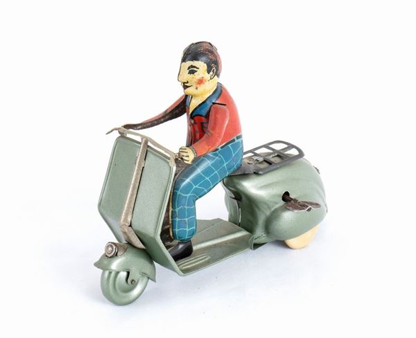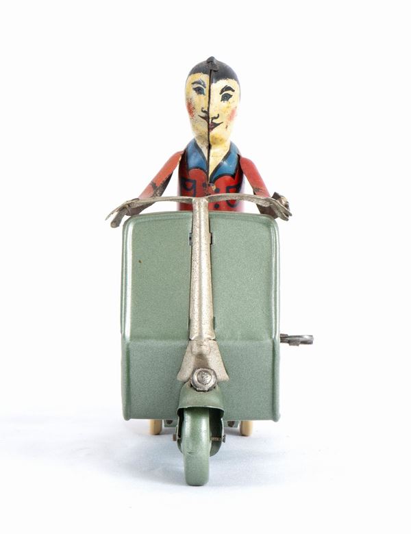 Giocattolo in latta litografata, VESPA faro basso con personaggio alla guida, meccanismo di carica a molla. Originale. Fine anni '940, Ferrari Siro Casalpusterlengo FSC, Italia