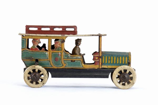 Penny toy in latta litografata, HESSMOBIL Germany, con meccanismo a volano. Autista esterno originale, 4 personaggi interni litografati. Anni '910