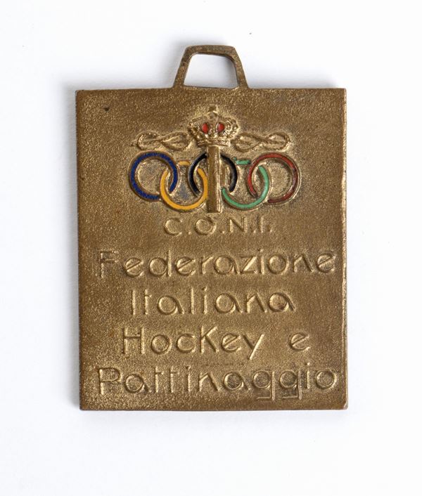 Medaglia rettangolare in metallo smaltato per Federazione Italiana Hockey e Pattinaggio, CONI, periodo fascista. Danni allo smalto all'angolo basso sinistro