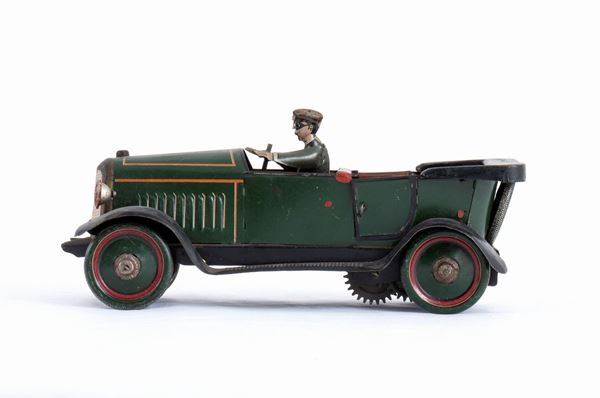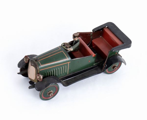 Automobile tipo LAMBDA scoperta, portiere posteriori apribili, autista alla guida a destra, in lamiera litografata. Meccanismo di carica a molla con chiave fissa. Targata I - 38 - 3304 . Ruote in latta a disco pieno. INGAP Made in Italy. Anni '930