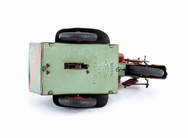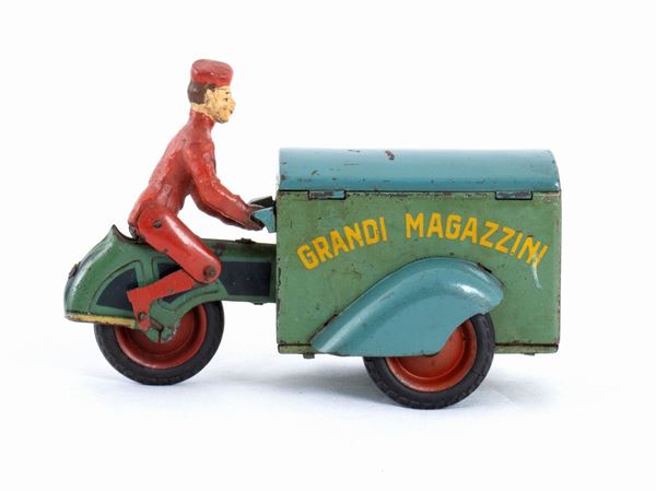 Ciclo cassonato, per trasporto merci dei GRANDI MAGAZZINI, con fattorino/ciclista. Il ciclo è in lamiera litografata, il ciclista è realizzato in composizione dalla ditta CC. Confalonieri di Milano. Cassone apribile, pneumatici in gomma, meccanismo di carica a molla. Anni '950