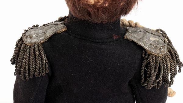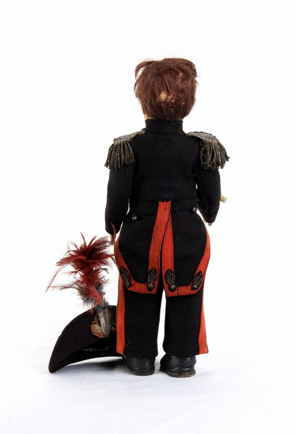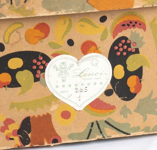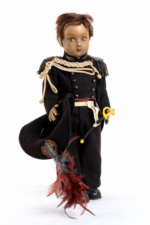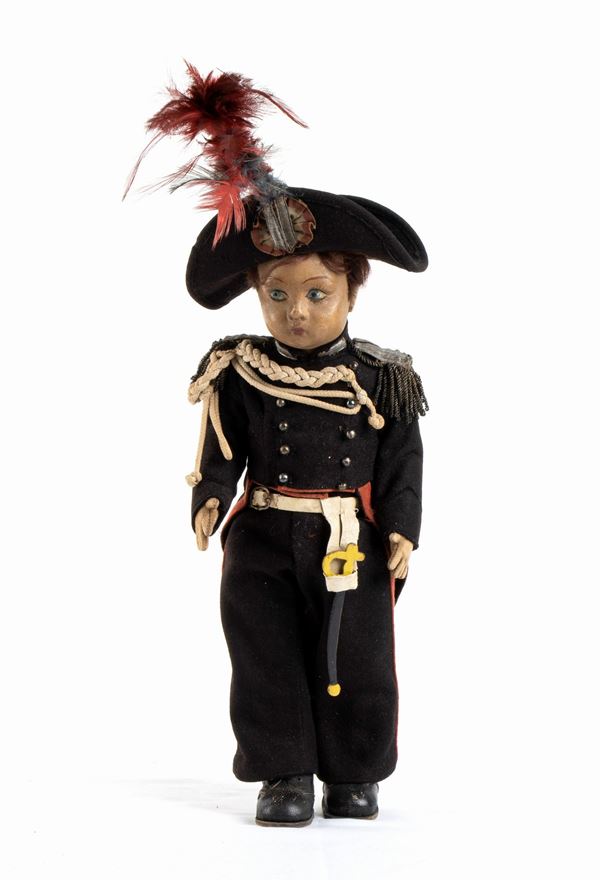 LENCI bambolotto vestito da Carabiniere Reale in Grande Uniforme Storica, GUS, completa di tutti gli accessori, dal cappello con piumaggio rosso e blu, al briquet (daga) portato di fianco, alle cordelline ed alle spalline a frangia. Nella sua scatola originale, marcata LENCI. Codice n. 265/1 riportato sulla scatola. Volto della bambola che necessita di una pulizia, qualche mancanza alla capigliatura/parrucca, vestito in ottime condizioni senza tracce di tarme o restauri. Originale dell'epoca