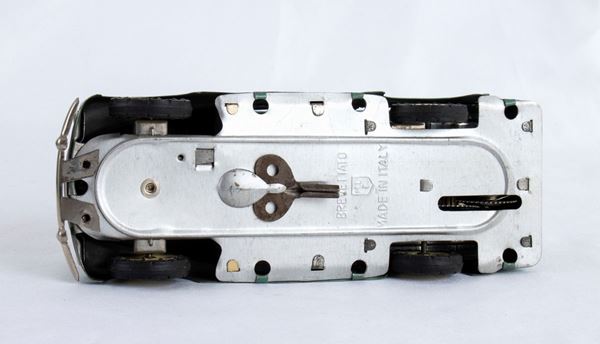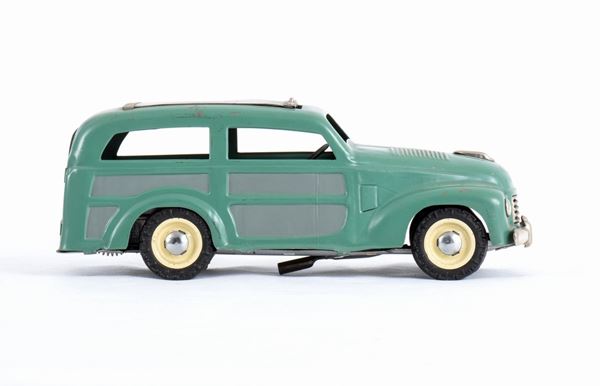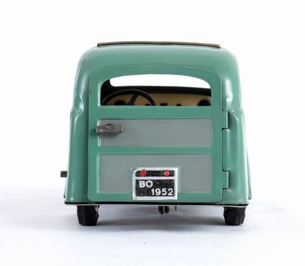Auto in latta litografata, FIAT 500 C modello Giardiniera Belvedere con tettuccio apribile (scorrevole in materiale plastico morbido). Colore verde con modanature grigie. Portellone posteriore apribile. Targato BO 1952. Marcato BREVETTATO MLB Made In Italy, meccanismo di carica a molla con chiave originale. Pneumatici in gomma. Anni '950