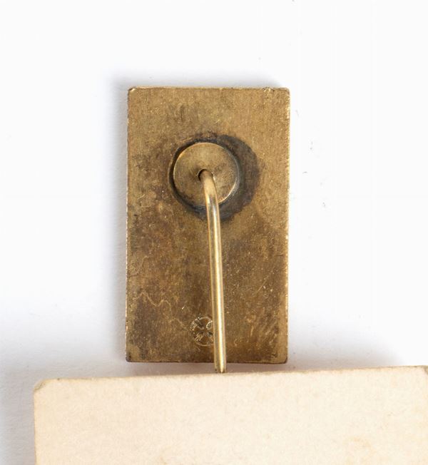 Distintivo a spillone per i nazionali giapponesi, partecipanti alle Olimpiadi. Su cartoncino originale. Marchio al retro del distintivo (piccolo quadrifoglio). Buone condizioni